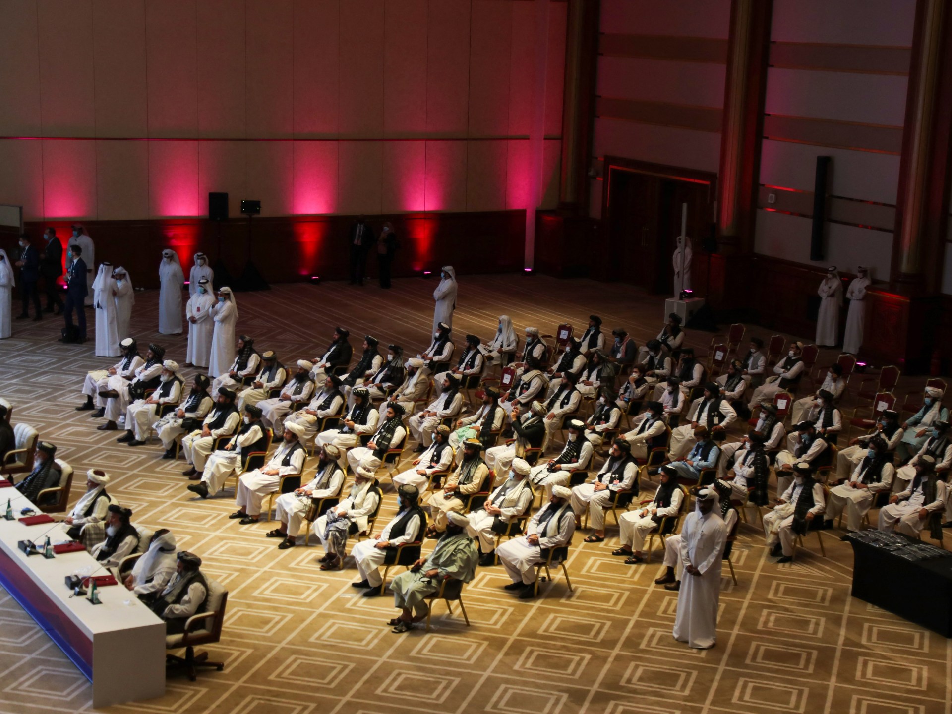 وفد من طالبان برئاسة عبد السلام حنفي نائب رئيس الوزراء الأفغاني (يمين) خلال محادثات السلام في الدوحة (الفرنسية)