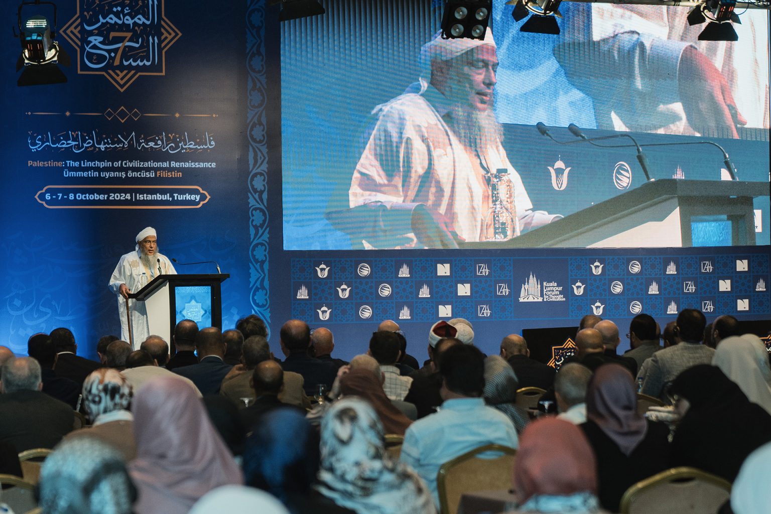 ومن جهته، أكد الشيخ محمد الحسن ولد الددو نائب رئيس المنتدى أن اختيار عقد المؤتمر السابع بهذا التوقيت والمكان لم يكن عشوائيًا، مشيرا إلى رمزية ذكرى السابع من أكتوبر/تشرين الأول ومعركة طوفان الأقصى، وإلى رمزية إسطنبول عاصمة الخلافة العثمانية، وهو ما “يشير إلى بداية إحياء جديد للأمة الإسلامية، وكأن طوفان الأقصى المبارك هو الشرارة لهذه النهضة”.