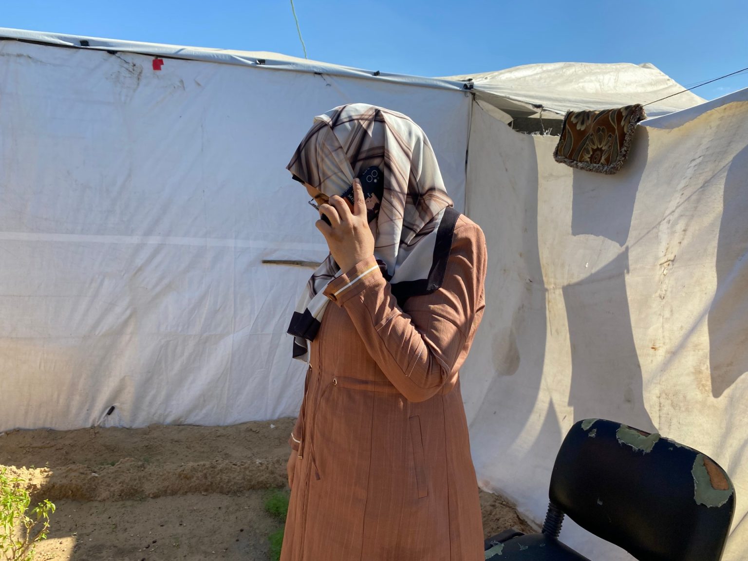 وبعناء شديد تتمكن هذه المرأة النازحة من منطقة “الجرن” المتاخمة لمخيم جباليا، من إجراء مكالمة ناجحة مع أحد أفراد أسرتها، الذين رفضوا النزوح وتمكسوا بالبقاء في منازلهم منذ اندلاع الحرب الإسرائيلية على القطاع عقب هجوم 7 أكتوبر/تشرين الأول من العام الماضي.