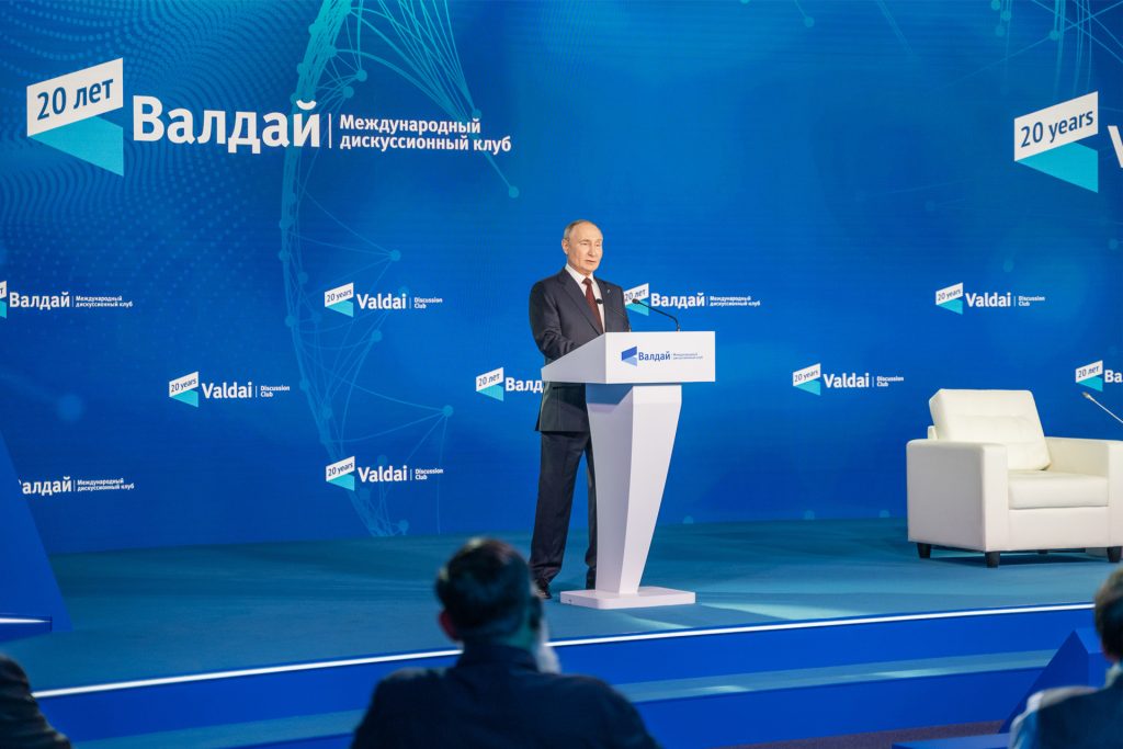 موسكو- نقاط عديدة ورسائل في أكثر من اتجاه تضمنها خطاب الرئيس الروسي فلاديمير بوتين في الجلسة العامة لنادي “فالداي” الدولي الذي اختتم أعماله أمس الخميس بمدينة سوتشي الروسية، حيث ذكر بوتين أن “نظاما عالميا جديدا تماما يتشكل أمام أعيننا”، وأن “البنية القديمة للعالم قد انتهت بلا رجعة، ويمكن للمرء أن يقول إنها انتهت بالفعل”.