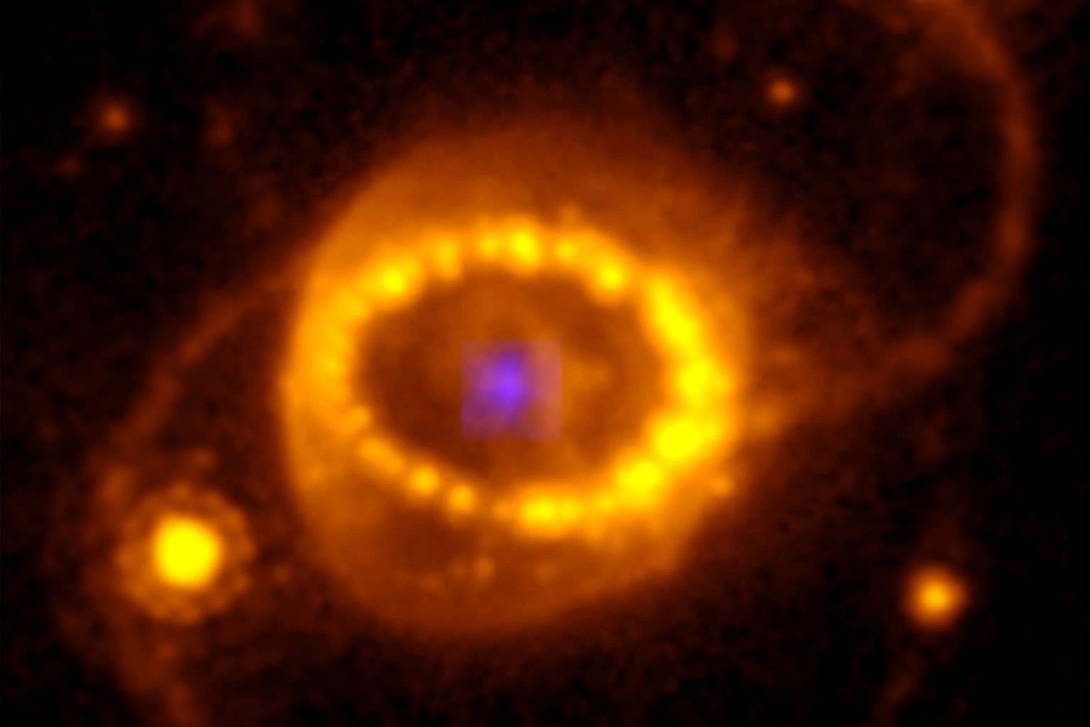 في مشهد خلّاب، يَظهر جسم صغير أرجواني اللون محاطٌ بهالة برتقالية ملتهبة، أقرب لأن يكون مشهدا من مشاهد سلسلة الأفلام الشهيرة “سيد الخواتيم” للروائي “جي آر آر تولكين”، والتي تبدو كعين “ساورون” الشريرة. والحقيقة أن الصورة ليست إلا لنجمٍ نيوتروني مختبئ داخل مستعر أعظم عملاق انفجر قبل 37 عاما.