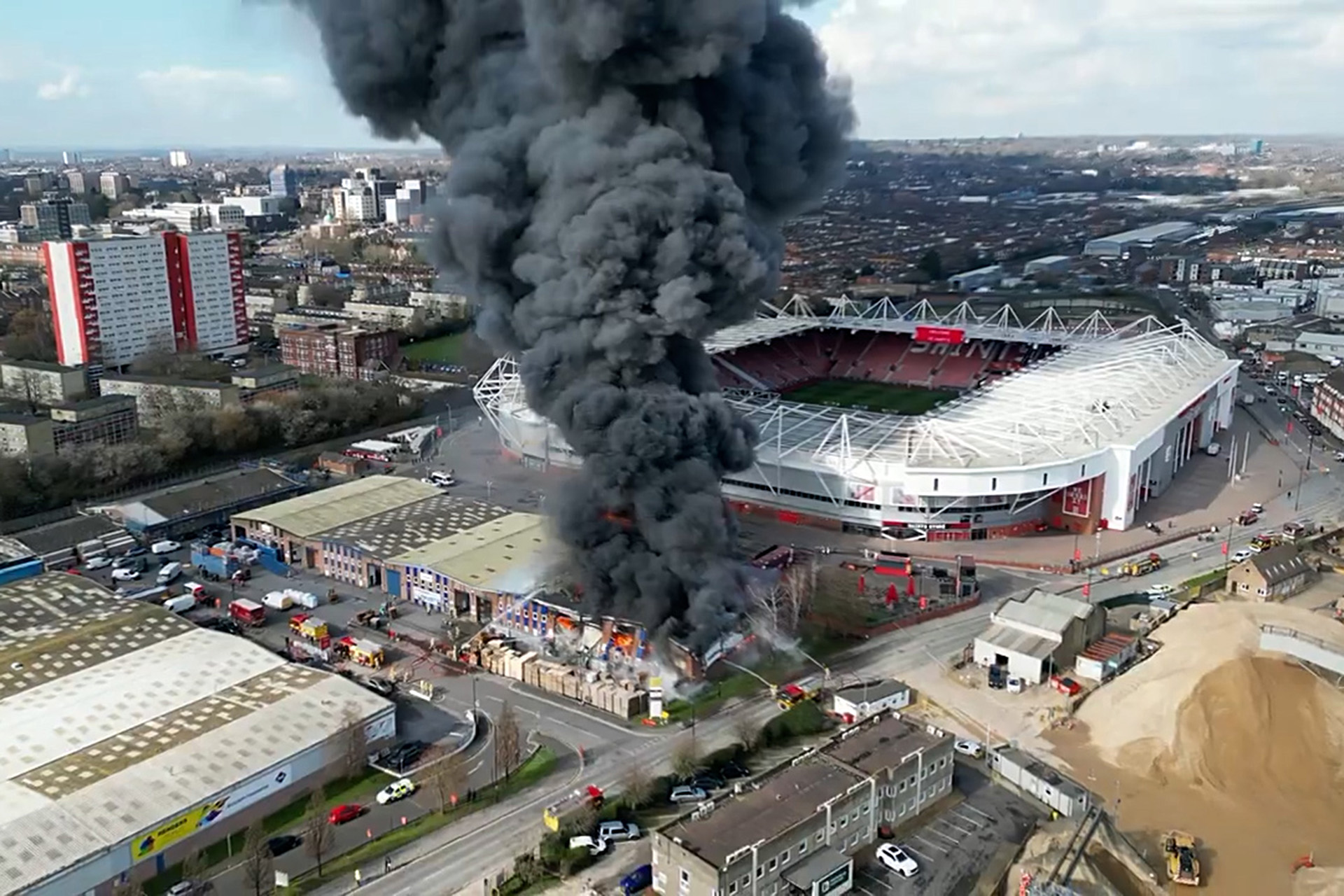وأشارت وكالة الأنباء البريطانية (بي إيه ميديا) إلى وجود 18 سيارة إطفاء لإخماد الحريق الذي التهم 4 وحدات صناعية على بعد أمتار قليلة من الملعب.