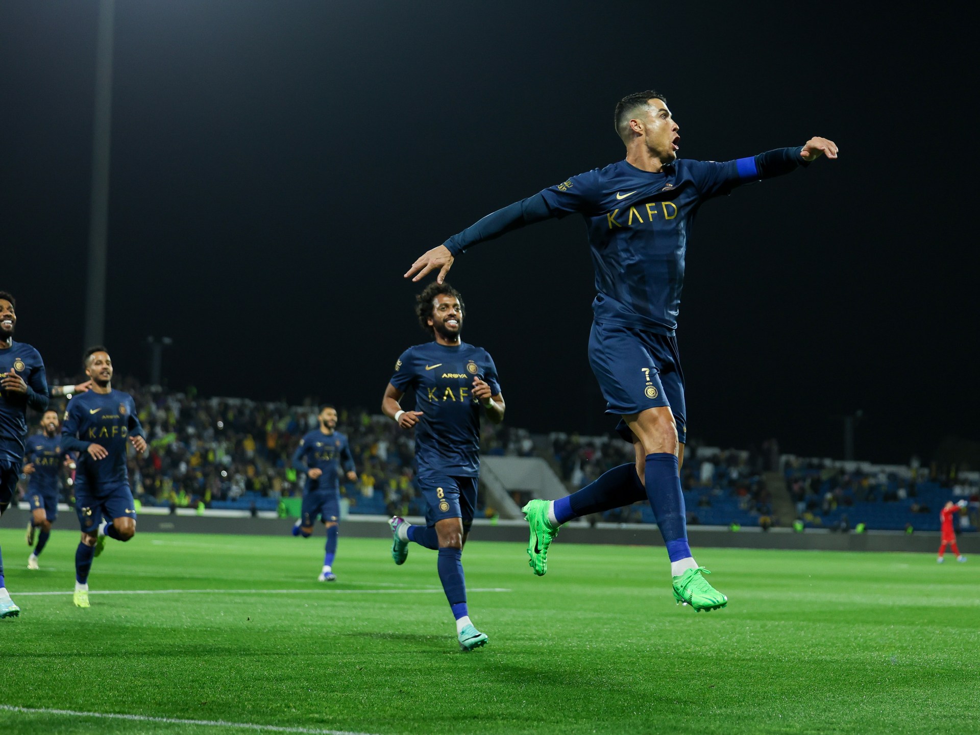وافتتح رونالدو التسجيل للنصر بعد مرور 11 دقيقة عبر ركلة حرة مباشرة من على حدود منطقة الجزاء سددها قوية لتصطدم الكرة بحارس أبها وتسكن الشباك. وأضاف قائد النصر الهدف الثاني في الدقيقة 21 من ركلة حرة أخرى من مسافة بعيدة.