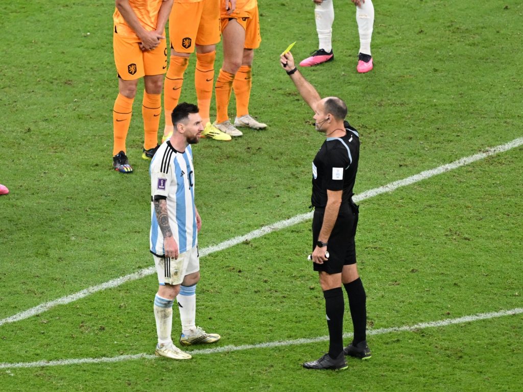 وأشهر الحكم الإسباني أنطونيو ماتيو لاهوز 16 بطاقة صفراء (رقم قياسي في مباراة واحدة بكأس العالم)، منها 8 للاعبي هولندا وبطاقة حمراء واحدة، كانت من نصيب دينزل دومفريس لحصوله على إنذارين أثناء تنفيذ ركلات الترجيح. كما حصل 8 لاعبين من الأرجنتين على إنذارات إلى جانب المدرب ليونيل سكالوني ومساعده والتر صامويل.