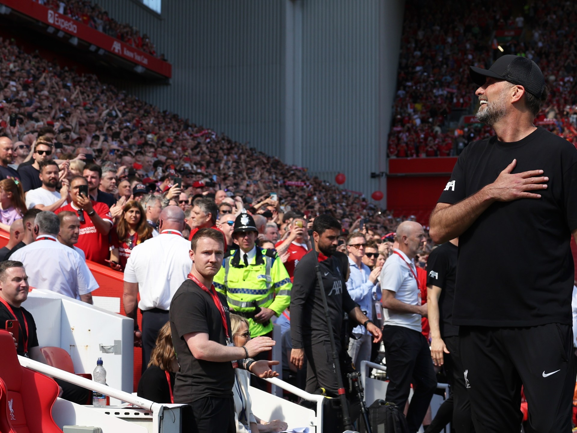 وفي كلمة مطولة ودع كلوب جماهير فريقه في ملعب أنفيلد بعد فوز ليفربول 2-صفر على ضيفه ولفرهامبتون في الجولة الأخيرة من موسم الدوري الممتاز أمس الأحد، وشارك مع الجمهور في أغنية من أجل المدرب المقبل أرنه سلوت الذي ستكون أمامه مهمة لا يستهان بها بكل تأكيد.