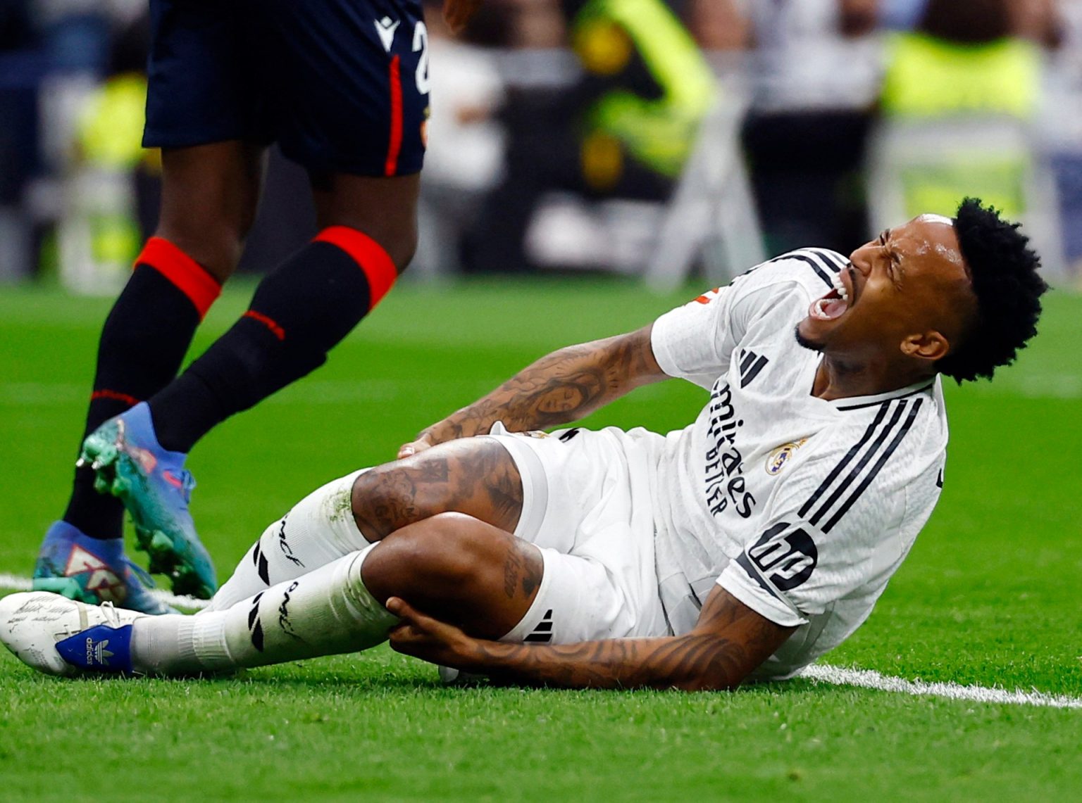 وسقط ميليتاو على الأرض خلال مباراة فريقه ضد أوساسونا، أمس السبت، في الجولة الـ13 من الدوري الإسباني، ليخرج على حمالة وهو يبكي قبل أن يعلن ريال مدريد، في بيان رسمي، أن مدافعه أُصيب بتمزق كامل في الرباط الصليبي الأمامي مع تلف في الغضروفين المفصليين في ركبة ساقه اليمنى.