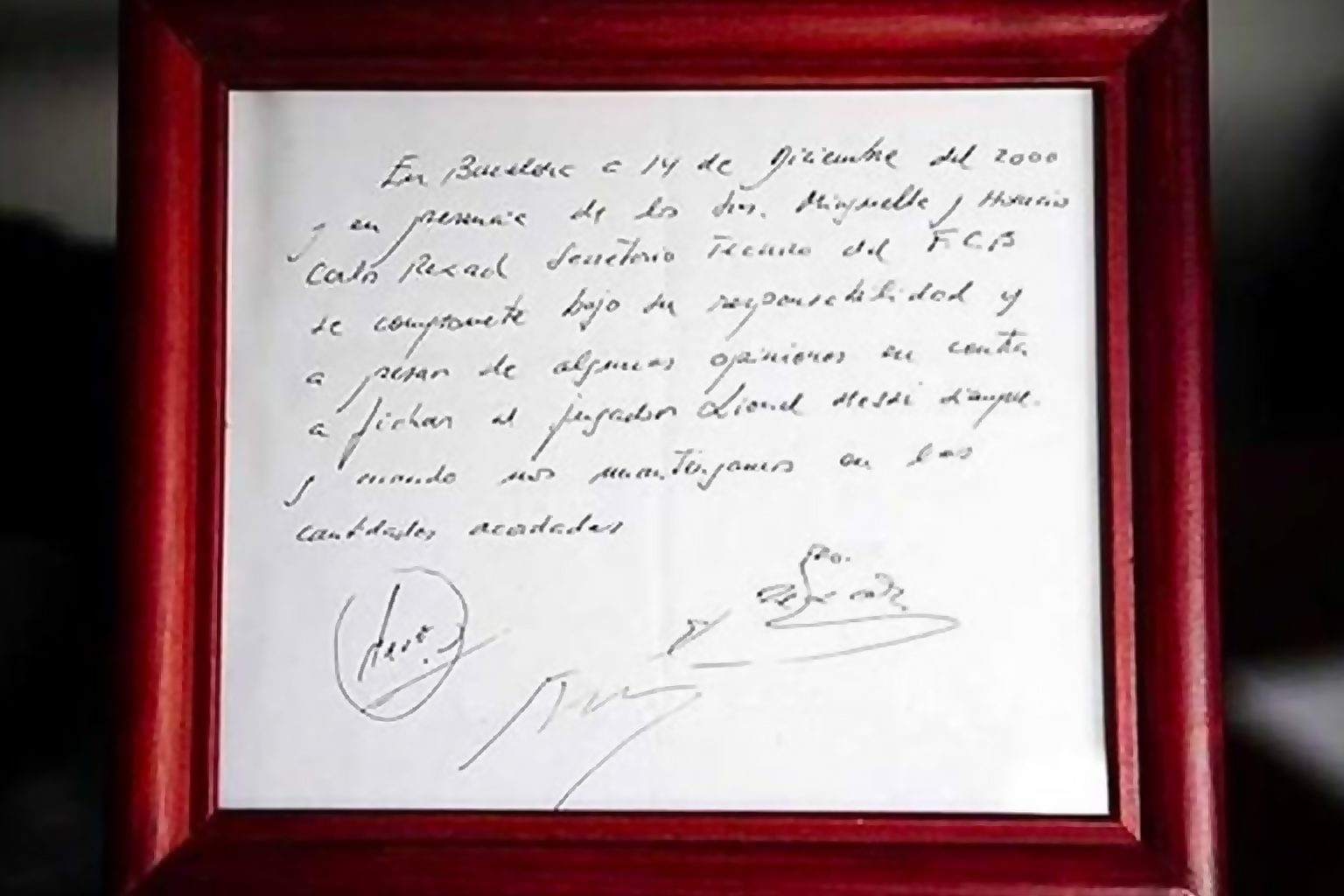 وكتب على المنديل الخاص بنادي بومبيا للتنس “إنه في 14 ديسمبر 2000 في برشلونة وبحضور السادة مينغيلا وهوراسيو، وافق كارليس ريشاك المدير الرياضي لنادي برشلونة بموجب هذا، وتحت مسؤوليته وبغض النظر عن أي آراء مخالفة، على التوقيع مع اللاعب ليونيل ميسي بشرط أن يتم ذلك بالمبالغ المتفق عليها”.