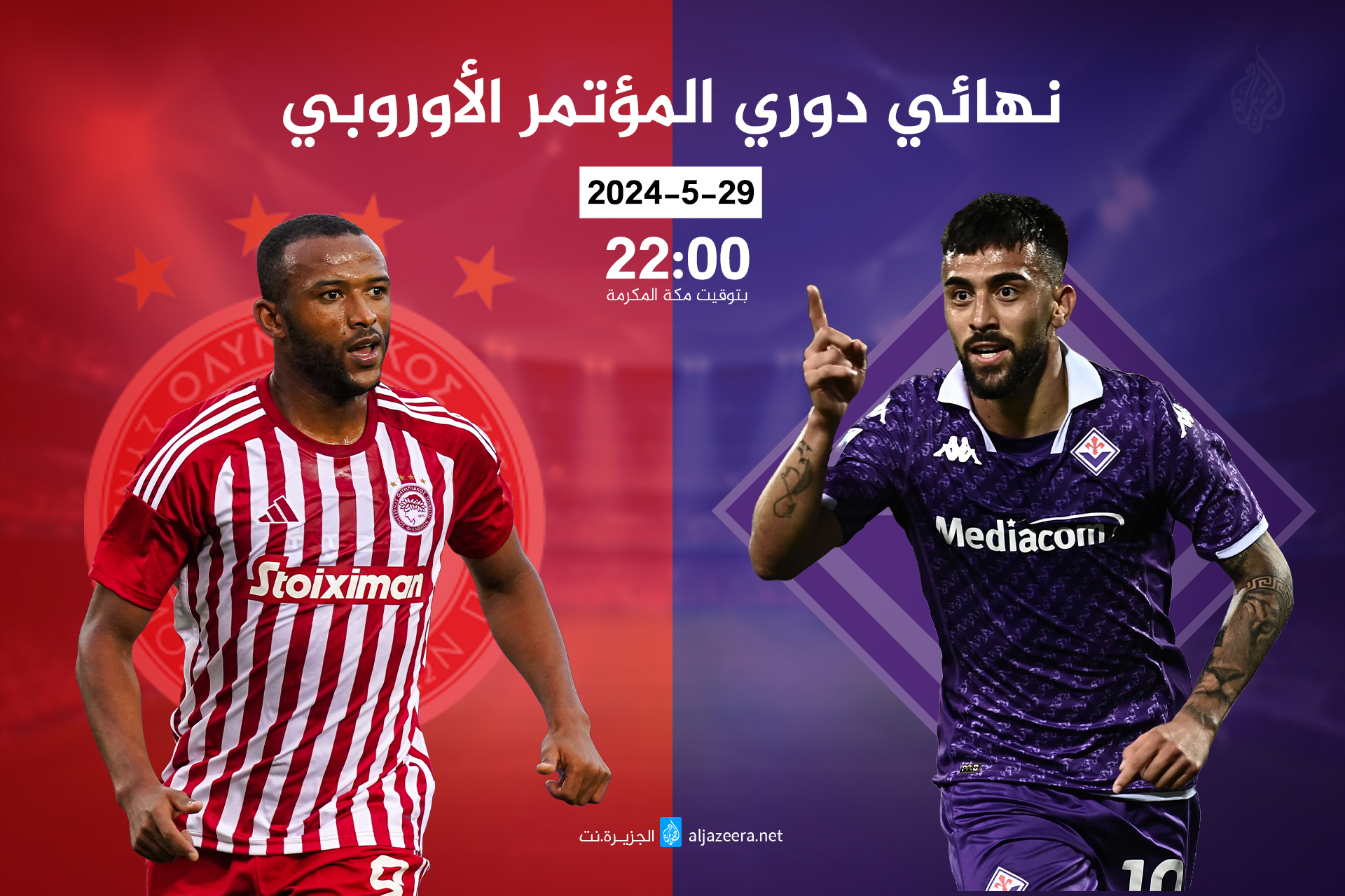 تقام المباراة النهائية لبطولة دوري المؤتمر الأوروبي لكرة القدم بين فريقي أولمبياكوس اليوناني وفيورنتينا الإيطالي، غدا الأربعاء، على ملعب أيك أرينا في أثينا.