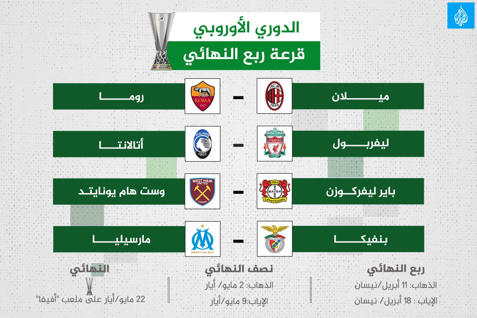 وتقام جولة الذهاب لدور الثمانية في 11 أبريل/نيسان المقبل بملاعب ميلان وليفربول وليفركوزن وبنفيكا، فيما تجرى جولة الإياب بعدها بأسبوع بملاعب روما وأتالانتا وويستهام ومارسيليا.