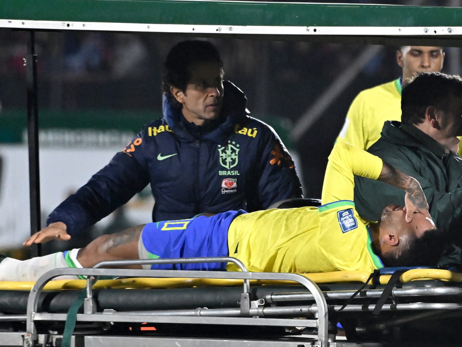 وخرج نيمار من ملعب المباراة، التي انتهت بخسارة البرازيل صفر-2، على محفة باكيا قبل نهاية الشوط الأول مباشرة، بعد التحام مع نيكولاس دي لاكروز، لاعب وسط أوروغواي.