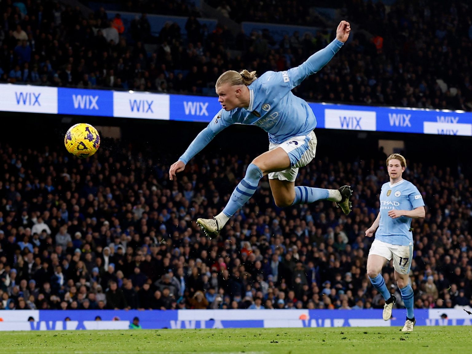 وينتظر هالاند وزملاؤه في مانشستر سيتي منافسة شرسة للغاية على اللقب، إذ يتصدر مانشستر سيتي الترتيب برصيد 73 نقطة، خلفه يتساوى أرسنال وليفربول برصيد 71 نقطة.