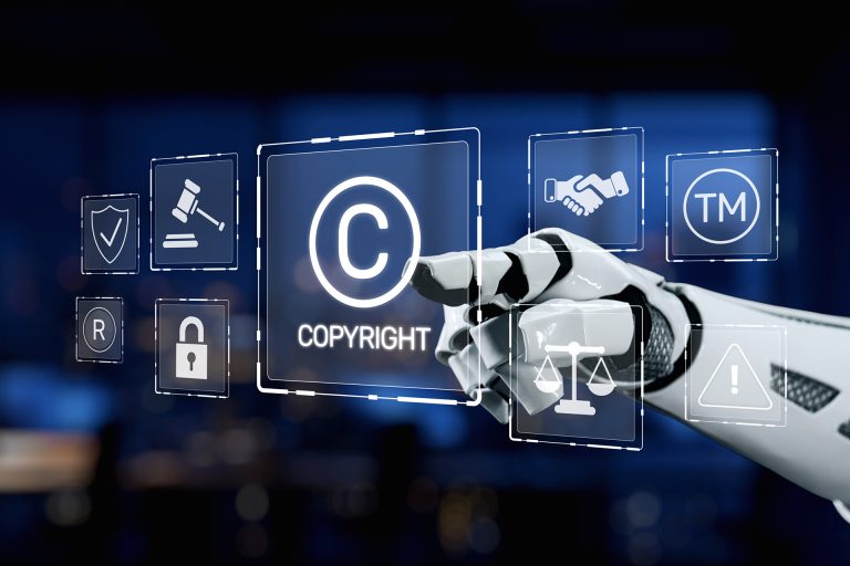 AI Image Rights and Media Law Scales of Justice Background with Photo Icon AI Sparkles Vector and Copy Space by sh99 @ادوبي ستوك